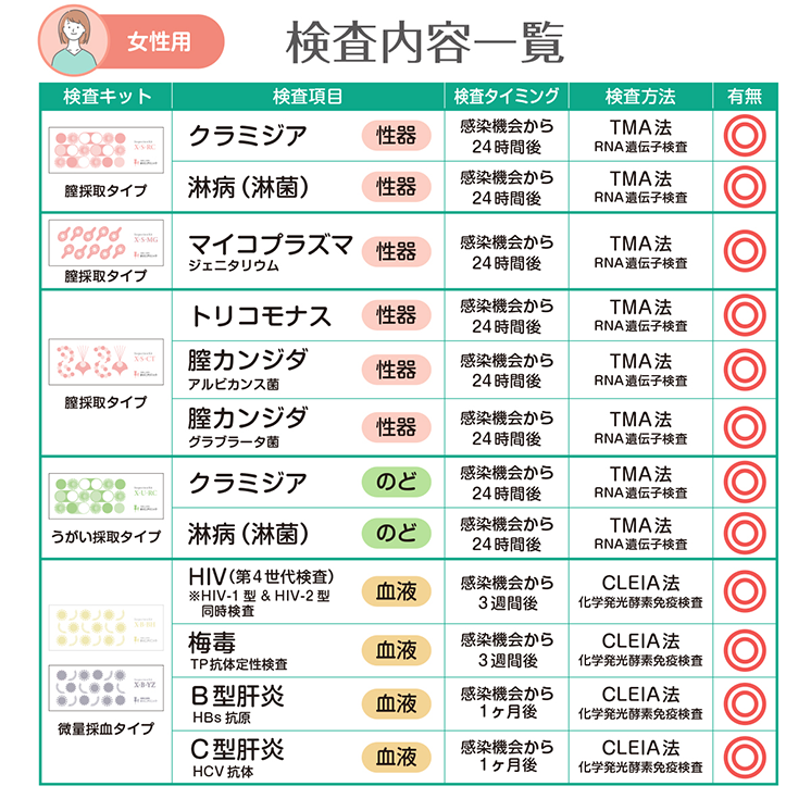 梅毒, HIV(エイズ), B型肝炎, C型肝炎, 咽頭クラミジア, 咽頭淋菌 (淋病), 膣クラミジア, 膣淋菌 (淋病), 膣マイコプラズマジェニタリウム, 膣トリコモナス, 膣カンジダ