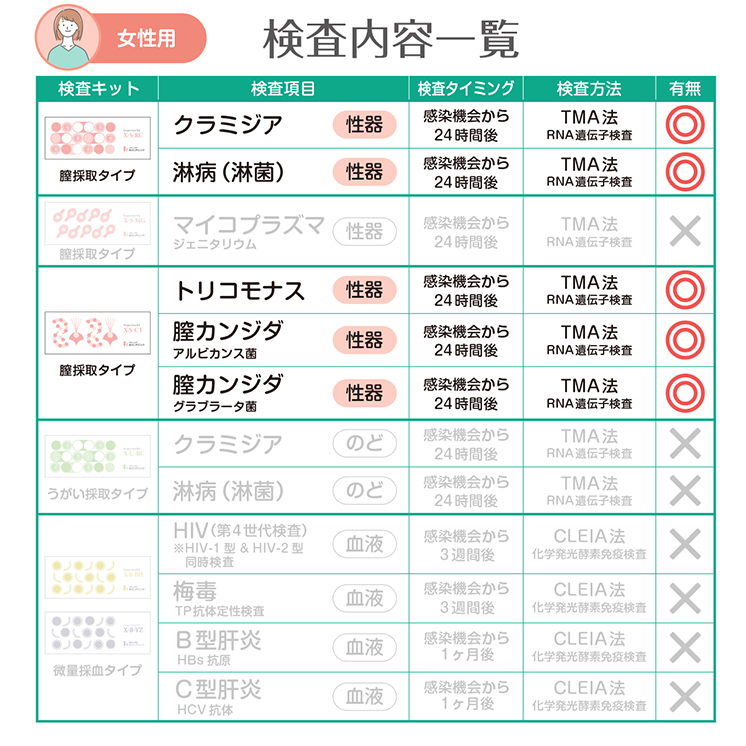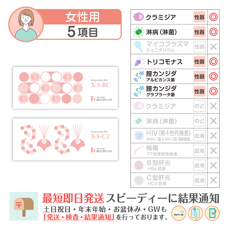 検査範囲 女性のみ 検査部位 膣(膣分泌物検査) 検査方法 遺伝子検査(TMA法) 内容物(使用期限) 膣採取キット(約4ヵ月) 検査項目詳細 膣クラミジア, 膣淋菌 (淋病), 膣トリコモナス, 膣カンジダ (アルビカンス菌), 膣カンジダ (グラブラータ菌) 検査施設 医療法人駒野会まりこ検査所(衛生検査所京都市第1046号) 販売業者 株式会社こまメディカル 製造国 アメリカ 所要日数 ご注文から最短2日 通知方法 SMSにて通知(専用サイトにアクセスしてご確認) 注意事項 検査キットには使用期限がございます。詳しい使用期限についてはお問い合わせください。 数量 12345678910 カートに入れる お気に入りに追加 数量 12345678910 カートに入れる お気に入りに追加 施設について Q&A どこで検査しているの? 許認可を受けた施設「まりこ検査所 (衛生検査所京都市第1046号)」にて検査業務を行っております。 ホントに遺伝子検査なの? PCR検査と同様の核酸増幅法の一つであるTMA法を用いた全自動遺伝子解析装置で「感度の高い遺伝子検査」を実施しています。 ホントに化学発光酵素免疫測定なの? 血液検査はCLEIA法(化学発光酵素免疫測定)を用いた全自動免疫測定装置で「感度の高い血液検査」を実施しています。 土曜、日曜、祝日も営業してますか? 土日祝日、年始年末、お盆休み、GWも年中無休で発送・検査・結果通知を行っております。 「郵送検査」も「まりこクリニック検査」も精度は同じですか? 郵送検査もクリニック検査も、同じ医療検査機器と同じ検査方法で、解析や測定を行っているため。検査結果の精度や感度は同じになります。 検査結果について Q&A 検査結果を確認するには? 検査結果はショートメッセージで通知します。(ログインIDやパスワードは不要) 陽性だった場合パートナーの薬ももらえる? パートナーのお薬処方はできません。パートナーも検査キットで陽性なら、お薬処方が可能です。 お薬郵送は必ずオンライン診療が必要なの? 治病薬を処方または郵送するには必ずオンライン診療が必要になります。 検査キット Q&A 結果までに追加費用は発生しませんか? 追加費用はありません。返送用の速達封筒も同封されております。ご安心ください。 医療保険は利用できますか? 当サイトで取り扱う検査キットは、すべて保険適用外(自由診療)となります。なお、オンライン診療については保険診療をご利用いただけます。 カンジタの菌を2種類検査するのは、なぜ? カンジダの適切な治療には、菌の種類を特定し治療することが必要です。 HIV-1型とHIV-2型の両方検査できますか? HIVは両方同時に測定しております。 ※HIV1型は「IgG抗体・IgM抗体・P24抗原」を測定 ※HIV2型は「IgG抗体・IgM抗体」を測定 トリコモナスも検査したほうがいいの? 来院患者様の検査では、淋菌とほぼ同数のトリコモナス陽性が確認されており、治療を行っております。 生理中はどうすればいい? 生理中の場合、出血が少ないタイミングで採取してください。少量の血液が混ざるのは問題ありませんが、血の塊が混ざらないように採取をお願いします。 その他 Q&A 別の購入方法は? Amazonまたは楽天市場にて購入が可能です。 Amazonで購入 楽天市場で購入 質問するにはどうすればいい? お問い合わせフォームより、ご遠慮なくお問い合わせください。 お問い合わせ 注文後キャンセルできますか? 検査の特性上、お申込み後や購入後の返品やキャンセルは不可となります。 数量 12345678910 カートに入れる お気に入りに追加