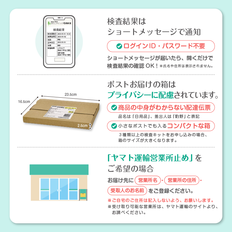 検査範囲 男性のみ 検査部位 尿道(尿検査), 喉(うがい検査) 検査方法 遺伝子検査(TMA法) 内容物(使用期限) 咽頭採取キット(約1年6ヵ月), 尿採取キット(約1年6ヵ月) 検査項目詳細 咽頭クラミジア, 咽頭淋菌 (淋病), 尿道クラミジア, 尿道淋菌 (淋病), 尿道トリコモナス, 尿道カンジダ (アルビカンス菌), 尿道カンジダ (グラブラータ菌) 検査施設 医療法人駒野会まりこ検査所(衛生検査所京都市第1046号) 販売業者 株式会社こまメディカル 製造国 アメリカ 所要日数 ご注文から最短2日 通知方法 SMSにて通知(専用サイトにアクセスしてご確認) 注意事項 検査キットには使用期限がございます。詳しい使用期限についてはお問い合わせください。 数量 12345678910 カートに入れる お気に入りに追加 数量 12345678910 カートに入れる お気に入りに追加 施設について Q&A どこで検査しているの? 許認可を受けた施設「まりこ検査所 (衛生検査所京都市第1046号)」にて検査業務を行っております。 ホントに遺伝子検査なの? PCR検査と同様の核酸増幅法の一つであるTMA法を用いた全自動遺伝子解析装置で「感度の高い遺伝子検査」を実施しています。 ホントに化学発光酵素免疫測定なの? 血液検査はCLEIA法(化学発光酵素免疫測定)を用いた全自動免疫測定装置で「感度の高い血液検査」を実施しています。 土曜、日曜、祝日も営業してますか? 土日祝日、年始年末、お盆休み、GWも年中無休で発送・検査・結果通知を行っております。 「郵送検査」も「まりこクリニック検査」も精度は同じですか? 郵送検査もクリニック検査も、同じ医療検査機器と同じ検査方法で、解析や測定を行っているため。検査結果の精度や感度は同じになります。 検査結果について Q&A 検査結果を確認するには? 検査結果はショートメッセージで通知します。(ログインIDやパスワードは不要) 陽性だった場合パートナーの薬ももらえる? パートナーのお薬処方はできません。パートナーも検査キットで陽性なら、お薬処方が可能です。 お薬郵送は必ずオンライン診療が必要なの? 治病薬を処方または郵送するには必ずオンライン診療が必要になります。 検査キット Q&A 結果までに追加費用は発生しませんか? 追加費用はありません。返送用の速達封筒も同封されております。ご安心ください。 医療保険は利用できますか? 当サイトで取り扱う検査キットは、すべて保険適用外(自由診療)となります。なお、オンライン診療については保険診療をご利用いただけます。 カンジタの菌を2種類検査するのは、なぜ? カンジダの適切な治療には、菌の種類を特定し治療することが必要です。 HIV-1型とHIV-2型の両方検査できますか? HIVは両方同時に測定しております。 ※HIV1型は「IgG抗体・IgM抗体・P24抗原」を測定 ※HIV2型は「IgG抗体・IgM抗体」を測定 トリコモナスも検査したほうがいいの? 来院患者様の検査では、淋菌とほぼ同数のトリコモナス陽性が確認されており、治療を行っております。 生理中はどうすればいい? 生理中の場合、出血が少ないタイミングで採取してください。少量の血液が混ざるのは問題ありませんが、血の塊が混ざらないように採取をお願いします。 その他 Q&A 別の購入方法は? Amazonまたは楽天市場にて購入が可能です。 Amazonで購入 楽天市場で購入 質問するにはどうすればいい? お問い合わせフォームより、ご遠慮なくお問い合わせください。 お問い合わせ 注文後キャンセルできますか? 検査の特性上、お申込み後や購入後の返品やキャンセルは不可となります。 数量 12345678910 カートに入れる お気に入りに追加