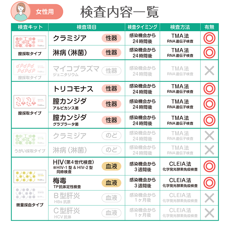 梅毒, HIV (エイズ), 膣クラミジア, 膣淋菌 (淋病), 膣トリコモナス, 膣カンジダ(アルビカンス菌), 膣カンジダ(グラブラータ菌)