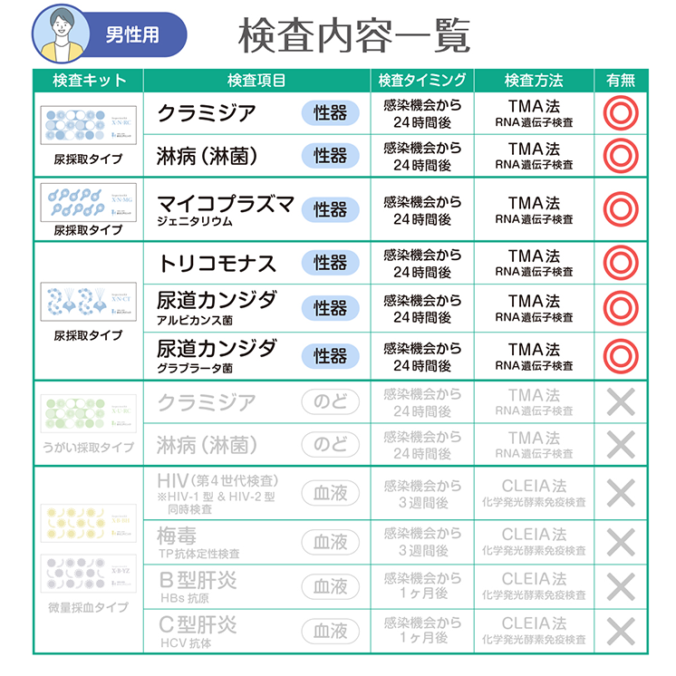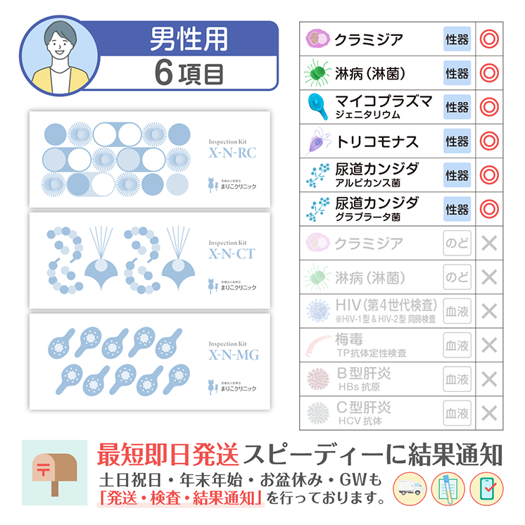 検査範囲 男性のみ 検査部位 尿道(尿検査) 検査方法 遺伝子検査(TMA法) 内容物(使用期限) 尿採取キット(約1年6ヵ月) 検査項目詳細 尿道クラミジア, 尿道淋菌 (淋病), 尿道マイコプラズ マジェニタリウム, 尿道トリコモナス, 尿道カンジダ(アルビカンス菌), 尿道カンジダ(グラブラータ菌) 検査施設 医療法人駒野会まりこ検査所(衛生検査所京都市第1046号) 販売業者 株式会社こまメディカル 製造国 アメリカ 所要日数 ご注文から最短2日 通知方法 SMSにて通知(専用サイトにアクセスしてご確認) 注意事項 検査キットには使用期限がございます。詳しい使用期限についてはお問い合わせください。 数量 12345678910 カートに入れる お気に入りに追加 数量 12345678910 カートに入れる お気に入りに追加 施設について Q&A どこで検査しているの? 許認可を受けた施設「まりこ検査所 (衛生検査所京都市第1046号)」にて検査業務を行っております。 ホントに遺伝子検査なの? PCR検査と同様の核酸増幅法の一つであるTMA法を用いた全自動遺伝子解析装置で「感度の高い遺伝子検査」を実施しています。 ホントに化学発光酵素免疫測定なの? 血液検査はCLEIA法(化学発光酵素免疫測定)を用いた全自動免疫測定装置で「感度の高い血液検査」を実施しています。 土曜、日曜、祝日も営業してますか? 土日祝日、年始年末、お盆休み、GWも年中無休で発送・検査・結果通知を行っております。 「郵送検査」も「まりこクリニック検査」も精度は同じですか? 郵送検査もクリニック検査も、同じ医療検査機器と同じ検査方法で、解析や測定を行っているため。検査結果の精度や感度は同じになります。 検査結果について Q&A 検査結果を確認するには? 検査結果はショートメッセージで通知します。(ログインIDやパスワードは不要) 検査結果通知が届かない 弊社からの通知が、お客様の設定により迷惑メールフォルダ(スパムフォルダ)に振り分けられている可能性がございます。まずはそちらをご確認ください。それでも通知が確認できない場合は、お手数ですがご連絡ください。ご本人様確認を行ったうえで、速やかに再送いたします。 陽性だった場合パートナーの薬ももらえる? パートナーのお薬処方はできません。パートナーも検査キットで陽性なら、お薬処方が可能です。 お薬郵送は必ずオンライン診療が必要なの? 治病薬を処方または郵送するには必ずオンライン診療が必要になります。 検査キット Q&A 結果までに追加費用は発生しませんか? 追加費用はありません。返送用の速達封筒も同封されております。ご安心ください。 医療保険は利用できますか? 当サイトで取り扱う検査キットは、すべて保険適用外(自由診療)となります。なお、オンライン診療については保険診療をご利用いただけます。 カンジタの菌を2種類検査するのは、なぜ? カンジダの適切な治療には、菌の種類を特定し治療することが必要です。 HIV-1型とHIV-2型の両方検査できますか? HIVは両方同時に測定しております。 ※HIV1型は「IgG抗体・IgM抗体・P24抗原」を測定 ※HIV2型は「IgG抗体・IgM抗体」を測定 トリコモナスも検査したほうがいいの? 来院患者様の検査では、淋菌とほぼ同数のトリコモナス陽性が確認されており、治療を行っております。 生理中はどうすればいい? 生理中の場合、出血が少ないタイミングで採取してください。少量の血液が混ざるのは問題ありませんが、血の塊が混ざらないように採取をお願いします。 その他 Q&A 別の購入方法は? Amazonまたは楽天市場にて購入が可能です。 Amazonで購入 楽天市場で購入 質問するにはどうすればいい? お問い合わせフォームより、ご遠慮なくお問い合わせください。 お問い合わせ 注文後キャンセルできますか? 検査の特性上、お申込み後や購入後の返品やキャンセルは不可となります。 数量 12345678910 カートに入れる お気に入りに追加