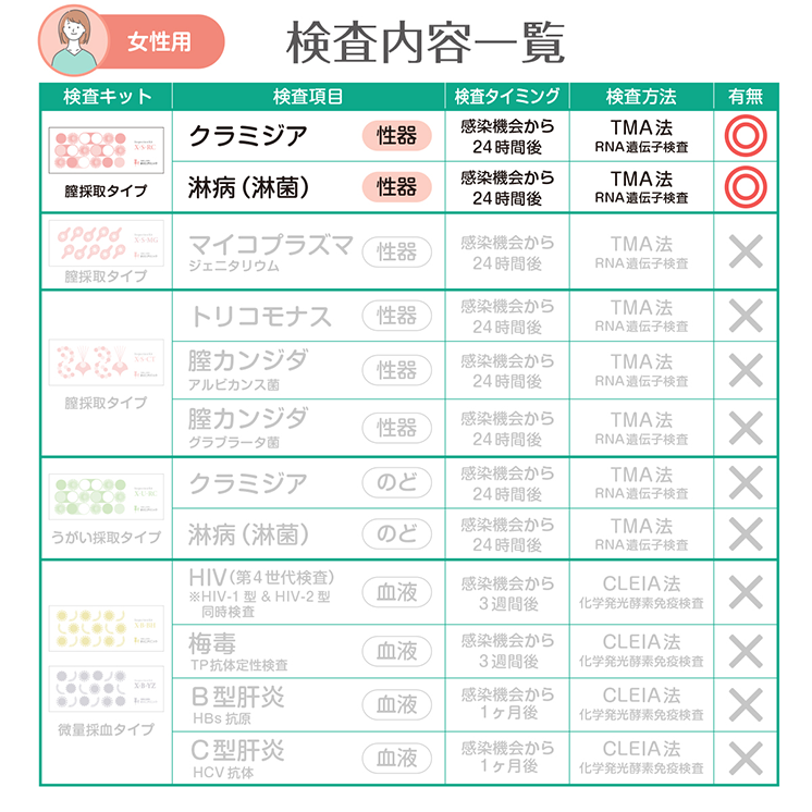 検査範囲 女性のみ 検査部位 膣(膣分泌物検査) 検査方法 遺伝子検査(TMA法) 内容物(使用期限) 膣採取キット(約4ヵ月) 検査項目詳細 膣クラミジア, 膣淋菌 (淋病) 検査施設 医療法人駒野会まりこ検査所(衛生検査所京都市第1046号) 販売業者 株式会社こまメディカル 製造国 アメリカ 所要日数 ご注文から最短2日 通知方法 SMSにて通知(専用サイトにアクセスしてご確認) 注意事項 検査キットには使用期限がございます。詳しい使用期限についてはお問い合わせください。 数量 12345678910 カートに入れる お気に入りに追加 数量 12345678910 カートに入れる お気に入りに追加 施設について Q&A どこで検査しているの? 許認可を受けた施設「まりこ検査所 (衛生検査所京都市第1046号)」にて検査業務を行っております。 ホントに遺伝子検査なの? PCR検査と同様の核酸増幅法の一つであるTMA法を用いた全自動遺伝子解析装置で「感度の高い遺伝子検査」を実施しています。 ホントに化学発光酵素免疫測定なの? 血液検査はCLEIA法(化学発光酵素免疫測定)を用いた全自動免疫測定装置で「感度の高い血液検査」を実施しています。 土曜、日曜、祝日も営業してますか? 土日祝日、年始年末、お盆休み、GWも年中無休で発送・検査・結果通知を行っております。 「郵送検査」も「まりこクリニック検査」も精度は同じですか? 郵送検査もクリニック検査も、同じ医療検査機器と同じ検査方法で、解析や測定を行っているため。検査結果の精度や感度は同じになります。 検査結果について Q&A 検査結果を確認するには? 検査結果はショートメッセージで通知します。(ログインIDやパスワードは不要) 検査結果通知が届かない 弊社からの通知が、お客様の設定により迷惑メールフォルダ(スパムフォルダ)に振り分けられている可能性がございます。まずはそちらをご確認ください。それでも通知が確認できない場合は、お手数ですがご連絡ください。ご本人様確認を行ったうえで、速やかに再送いたします。 陽性だった場合パートナーの薬ももらえる? パートナーのお薬処方はできません。パートナーも検査キットで陽性なら、お薬処方が可能です。 お薬郵送は必ずオンライン診療が必要なの? 治病薬を処方または郵送するには必ずオンライン診療が必要になります。 検査キット Q&A 結果までに追加費用は発生しませんか? 追加費用はありません。返送用の速達封筒も同封されております。ご安心ください。 医療保険は利用できますか? 当サイトで取り扱う検査キットは、すべて保険適用外(自由診療)となります。なお、オンライン診療については保険診療をご利用いただけます。 カンジタの菌を2種類検査するのは、なぜ? カンジダの適切な治療には、菌の種類を特定し治療することが必要です。 HIV-1型とHIV-2型の両方検査できますか? HIVは両方同時に測定しております。 ※HIV1型は「IgG抗体・IgM抗体・P24抗原」を測定 ※HIV2型は「IgG抗体・IgM抗体」を測定 トリコモナスも検査したほうがいいの? 来院患者様の検査では、淋菌とほぼ同数のトリコモナス陽性が確認されており、治療を行っております。 生理中はどうすればいい? 生理中の場合、出血が少ないタイミングで採取してください。少量の血液が混ざるのは問題ありませんが、血の塊が混ざらないように採取をお願いします。 その他 Q&A 別の購入方法は? Amazonまたは楽天市場にて購入が可能です。 Amazonで購入 楽天市場で購入 質問するにはどうすればいい? お問い合わせフォームより、ご遠慮なくお問い合わせください。 お問い合わせ 注文後キャンセルできますか? 検査の特性上、お申込み後や購入後の返品やキャンセルは不可となります。 数量 12345678910 カートに入れる お気に入りに追加