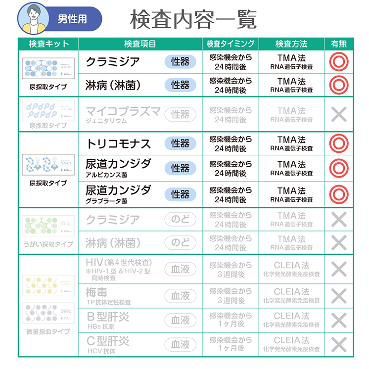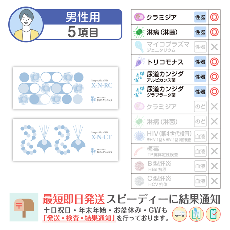 検査範囲 男性のみ 検査部位 尿道(尿検査) 検査方法 遺伝子検査(TMA法) 内容物(使用期限) 尿採取キット(約1年6ヵ月) 検査項目詳細 尿道クラミジア, 尿道淋菌 (淋病), 尿道トリコモナス, 尿道カンジダ (アルビカンス菌), 尿道カンジダ (グラブラータ菌) 検査施設 医療法人駒野会まりこ検査所(衛生検査所京都市第1046号) 販売業者 株式会社こまメディカル 製造国 アメリカ 所要日数 ご注文から最短2日 通知方法 SMSにて通知(専用サイトにアクセスしてご確認) 注意事項 検査キットには使用期限がございます。詳しい使用期限についてはお問い合わせください。 数量 12345678910 カートに入れる お気に入りに追加 数量 12345678910 カートに入れる お気に入りに追加 施設について Q&A どこで検査しているの? 許認可を受けた施設「まりこ検査所 (衛生検査所京都市第1046号)」にて検査業務を行っております。 ホントに遺伝子検査なの? PCR検査と同様の核酸増幅法の一つであるTMA法を用いた全自動遺伝子解析装置で「感度の高い遺伝子検査」を実施しています。 ホントに化学発光酵素免疫測定なの? 血液検査はCLEIA法(化学発光酵素免疫測定)を用いた全自動免疫測定装置で「感度の高い血液検査」を実施しています。 土曜、日曜、祝日も営業してますか? 土日祝日、年始年末、お盆休み、GWも年中無休で発送・検査・結果通知を行っております。 「郵送検査」も「まりこクリニック検査」も精度は同じですか? 郵送検査もクリニック検査も、同じ医療検査機器と同じ検査方法で、解析や測定を行っているため。検査結果の精度や感度は同じになります。 検査結果について Q&A 検査結果を確認するには? 検査結果はショートメッセージで通知します。(ログインIDやパスワードは不要) 検査結果通知が届かない 弊社からの通知が、お客様の設定により迷惑メールフォルダ(スパムフォルダ)に振り分けられている可能性がございます。まずはそちらをご確認ください。それでも通知が確認できない場合は、お手数ですがご連絡ください。ご本人様確認を行ったうえで、速やかに再送いたします。 陽性だった場合パートナーの薬ももらえる? パートナーのお薬処方はできません。パートナーも検査キットで陽性なら、お薬処方が可能です。 お薬郵送は必ずオンライン診療が必要なの? 治病薬を処方または郵送するには必ずオンライン診療が必要になります。 検査キット Q&A 結果までに追加費用は発生しませんか? 追加費用はありません。返送用の速達封筒も同封されております。ご安心ください。 医療保険は利用できますか? 当サイトで取り扱う検査キットは、すべて保険適用外(自由診療)となります。なお、オンライン診療については保険診療をご利用いただけます。 カンジタの菌を2種類検査するのは、なぜ? カンジダの適切な治療には、菌の種類を特定し治療することが必要です。 HIV-1型とHIV-2型の両方検査できますか? HIVは両方同時に測定しております。 ※HIV1型は「IgG抗体・IgM抗体・P24抗原」を測定 ※HIV2型は「IgG抗体・IgM抗体」を測定 トリコモナスも検査したほうがいいの? 来院患者様の検査では、淋菌とほぼ同数のトリコモナス陽性が確認されており、治療を行っております。 生理中はどうすればいい? 生理中の場合、出血が少ないタイミングで採取してください。少量の血液が混ざるのは問題ありませんが、血の塊が混ざらないように採取をお願いします。 その他 Q&A 別の購入方法は? Amazonまたは楽天市場にて購入が可能です。 Amazonで購入 楽天市場で購入 質問するにはどうすればいい? お問い合わせフォームより、ご遠慮なくお問い合わせください。 お問い合わせ 注文後キャンセルできますか? 検査の特性上、お申込み後や購入後の返品やキャンセルは不可となります。 数量 12345678910 カートに入れる お気に入りに追加