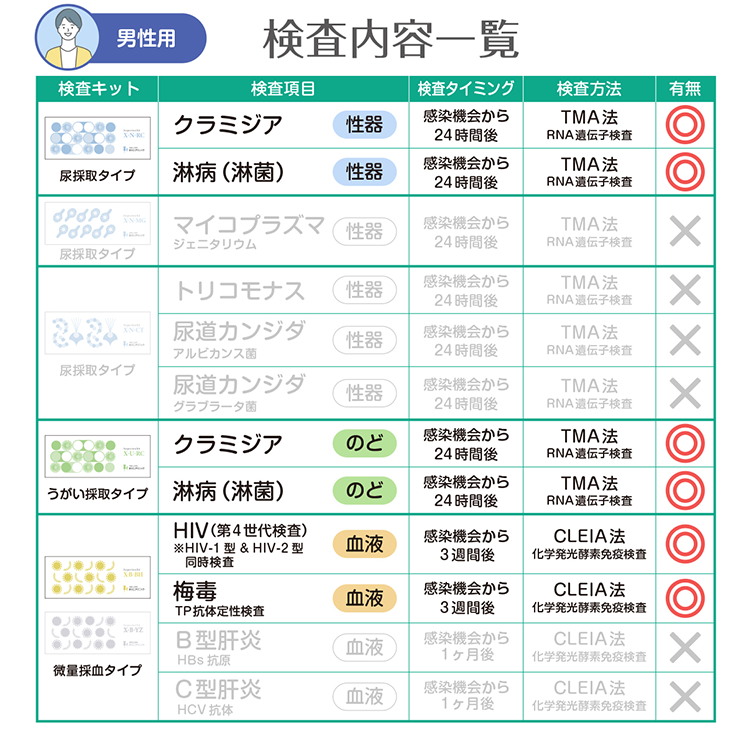 梅毒, HIV (エイズ), 咽頭クラミジア, 咽頭淋菌 (淋病), 尿道クラミジア, 尿道淋菌 (淋病)