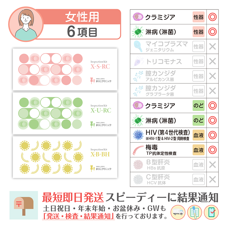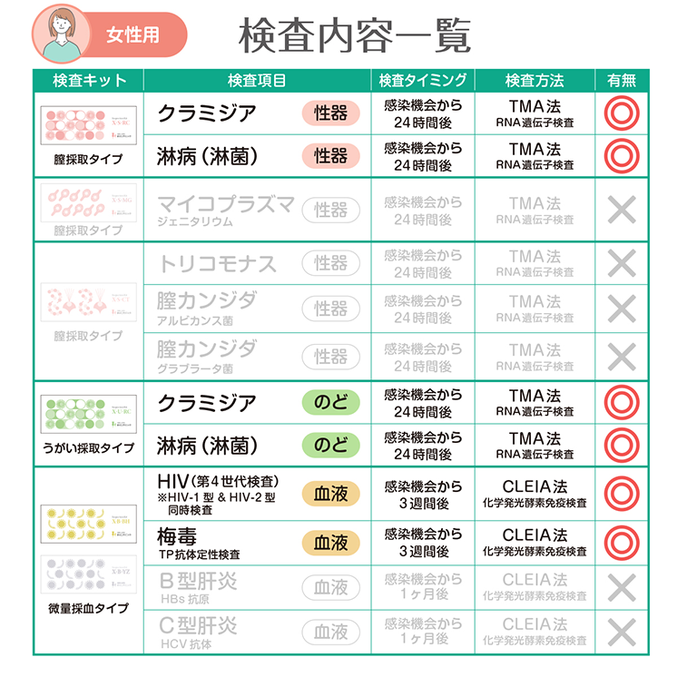 梅毒, HIV (エイズ), 咽頭クラミジア, 咽頭淋菌 (淋病), 膣クラミジア, 膣淋菌 (淋病)