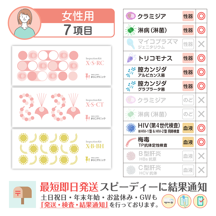 梅毒, HIV (エイズ), 膣クラミジア, 膣淋菌 (淋病), 膣トリコモナス, 膣カンジダ(アルビカンス菌), 膣カンジダ(グラブラータ菌)