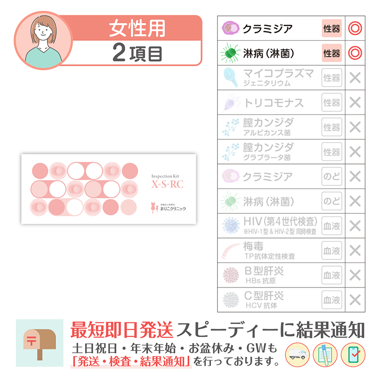 検査範囲 女性のみ 検査部位 膣(膣分泌物検査) 検査方法 遺伝子検査(TMA法) 内容物(使用期限) 膣採取キット(約4ヵ月) 検査項目詳細 膣クラミジア, 膣淋菌 (淋病) 検査施設 医療法人駒野会まりこ検査所(衛生検査所京都市第1046号) 販売業者 株式会社こまメディカル 製造国 アメリカ 所要日数 ご注文から最短2日 通知方法 SMSにて通知(専用サイトにアクセスしてご確認) 注意事項 検査キットには使用期限がございます。詳しい使用期限についてはお問い合わせください。 数量 12345678910 カートに入れる お気に入りに追加 数量 12345678910 カートに入れる お気に入りに追加 施設について Q&A どこで検査しているの? 許認可を受けた施設「まりこ検査所 (衛生検査所京都市第1046号)」にて検査業務を行っております。 ホントに遺伝子検査なの? PCR検査と同様の核酸増幅法の一つであるTMA法を用いた全自動遺伝子解析装置で「感度の高い遺伝子検査」を実施しています。 ホントに化学発光酵素免疫測定なの? 血液検査はCLEIA法(化学発光酵素免疫測定)を用いた全自動免疫測定装置で「感度の高い血液検査」を実施しています。 土曜、日曜、祝日も営業してますか? 土日祝日、年始年末、お盆休み、GWも年中無休で発送・検査・結果通知を行っております。 「郵送検査」も「まりこクリニック検査」も精度は同じですか? 郵送検査もクリニック検査も、同じ医療検査機器と同じ検査方法で、解析や測定を行っているため。検査結果の精度や感度は同じになります。 検査結果について Q&A 検査結果を確認するには? 検査結果はショートメッセージで通知します。(ログインIDやパスワードは不要) 検査結果通知が届かない 弊社からの通知が、お客様の設定により迷惑メールフォルダ(スパムフォルダ)に振り分けられている可能性がございます。まずはそちらをご確認ください。それでも通知が確認できない場合は、お手数ですがご連絡ください。ご本人様確認を行ったうえで、速やかに再送いたします。 陽性だった場合パートナーの薬ももらえる? パートナーのお薬処方はできません。パートナーも検査キットで陽性なら、お薬処方が可能です。 お薬郵送は必ずオンライン診療が必要なの? 治病薬を処方または郵送するには必ずオンライン診療が必要になります。 検査キット Q&A 結果までに追加費用は発生しませんか? 追加費用はありません。返送用の速達封筒も同封されております。ご安心ください。 医療保険は利用できますか? 当サイトで取り扱う検査キットは、すべて保険適用外(自由診療)となります。なお、オンライン診療については保険診療をご利用いただけます。 カンジタの菌を2種類検査するのは、なぜ? カンジダの適切な治療には、菌の種類を特定し治療することが必要です。 HIV-1型とHIV-2型の両方検査できますか? HIVは両方同時に測定しております。 ※HIV1型は「IgG抗体・IgM抗体・P24抗原」を測定 ※HIV2型は「IgG抗体・IgM抗体」を測定 トリコモナスも検査したほうがいいの? 来院患者様の検査では、淋菌とほぼ同数のトリコモナス陽性が確認されており、治療を行っております。 生理中はどうすればいい? 生理中の場合、出血が少ないタイミングで採取してください。少量の血液が混ざるのは問題ありませんが、血の塊が混ざらないように採取をお願いします。 その他 Q&A 別の購入方法は? Amazonまたは楽天市場にて購入が可能です。 Amazonで購入 楽天市場で購入 質問するにはどうすればいい? お問い合わせフォームより、ご遠慮なくお問い合わせください。 お問い合わせ 注文後キャンセルできますか? 検査の特性上、お申込み後や購入後の返品やキャンセルは不可となります。 数量 12345678910 カートに入れる お気に入りに追加